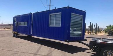 Modular building and offices can be transported on the system. The modular buildings and offices can be transported to their locations and moved with ease when the event or job is complete.